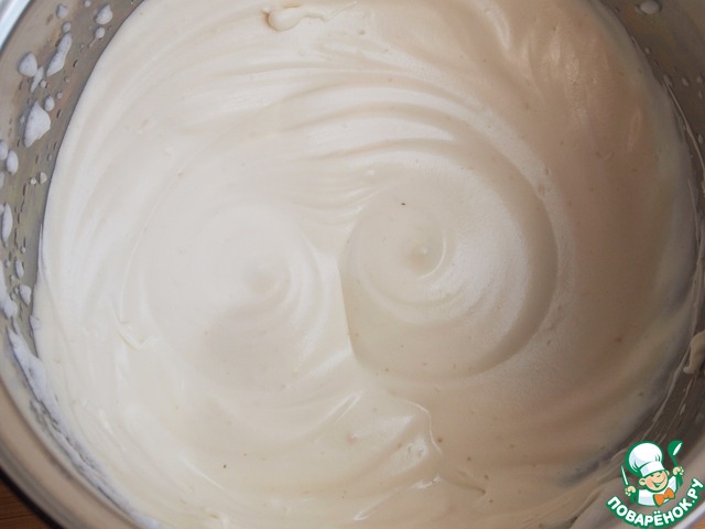 Теперь займемся начинкой. Белок отделить от желтка, взбить миксером в пышную пену. Затем добавить сахар.