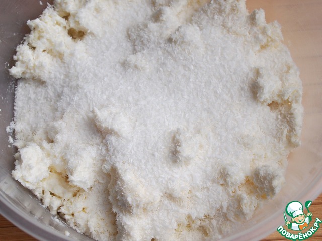 Творог размять вилкой (если творог зернистый, то протереть через сито), добавить кокосовую стружку. Хорошо перемешать.