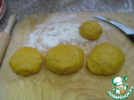 Скатать тесто в колбаску и отрезать не большой кусочек, остальное разделить на 3 равные части, каждую скатать в шар.