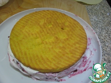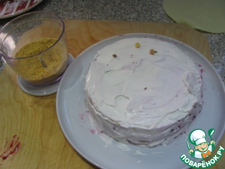 Густо намазываем последний корж оставшимися сливками, включая бока.