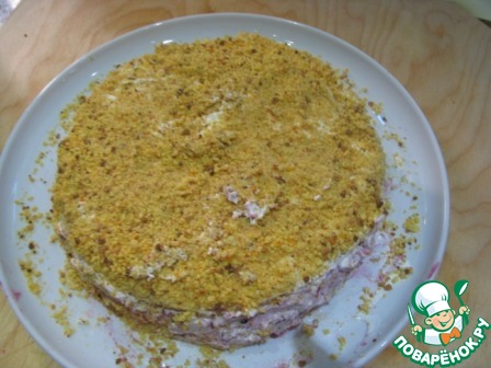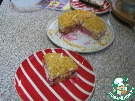 Последний маленький шар теста, тонко раскатываем, и выпекаем его так, чтобы его можно было-бы измельчить в крошку (как для Наполеона), Посыпаем верх крошкой, включая (по-возможности) и бока. Закрываем пластиковой крышкой и ставим на несколько часов в холодильник для пропитки. У меня простоял 3 часа. Режем на 8 частей, но у меня муж любит большие порции, я порезала на 4 части.