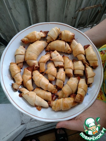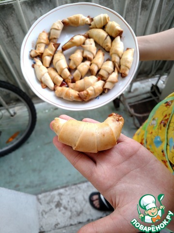 Приготовим тесто. Смешаем муку+дрожжи+сахар+те плая вода+кусочками размягченное масло. Вымешиваем тесто 5 минут, формируя шар. Оставляем наше тесто на 15 минут под полотенцем в теплом влажном месте. Формируем треугольнички, кладем начинку и сворачиваем от более широкой стороне к узкой. Выкладываем на противень.