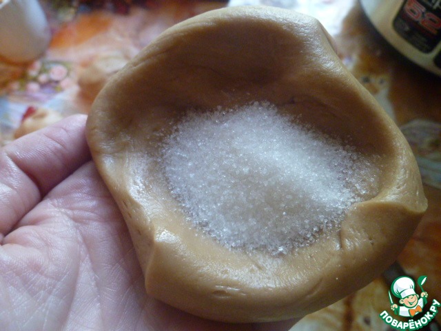 Тесто делим на части, каждую часть в лепешку, на лепешку кладем сахар по своему усмотрению