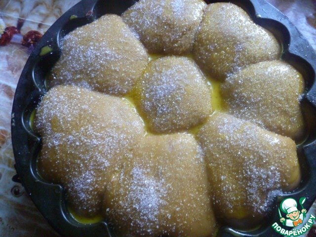 Когда тесто поднялось, то я смазала их желтком смешанным с молоком и посыпала сахаром.