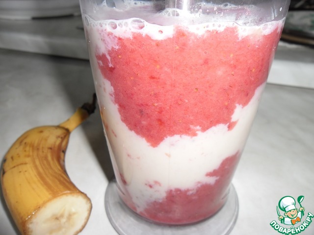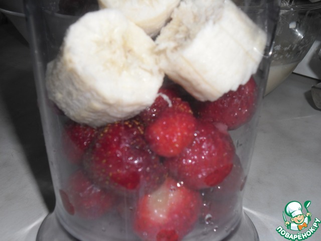 Клубнику и банан помыть, очистить от плодоножек и кожуры. Банан порезать на крупные кусочки.