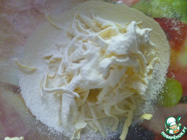 Для начала нужно натереть маргарин на терке, сверху просеиваем муку, смешанную с содой.