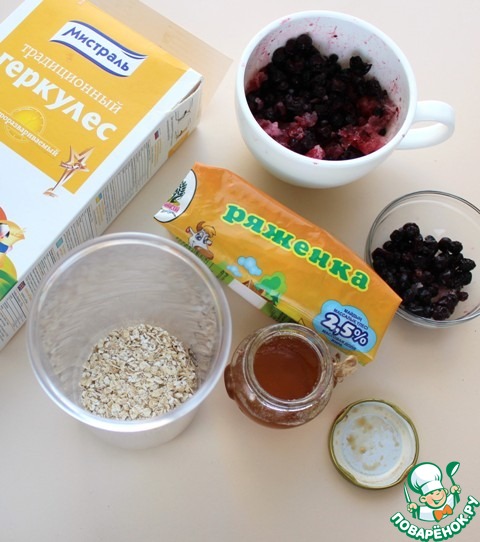 В чашу блендера насыпьте овсяные хлопья геркулес ТМ Мистраль, насыпьте смородину, положите 2 столовых ложки меда, налейте ряженку и взбейте.