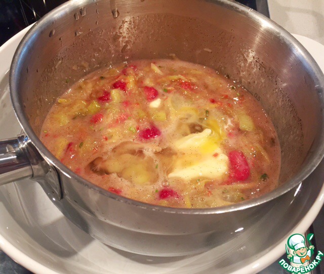 Смело приступаем к начинке. В сотейник всыпьте сахар, добавьте зерна одного стручка ванили и всыпьте очищенный и порезанный на дольки ревень. Цедру лимона нарежьте лапшой и добавьте к ревеню. Дальше время малины и мяты с мелко нарезанным розмарином! И кубиком нарежьте одно яблоко и смело поварите все вместе!