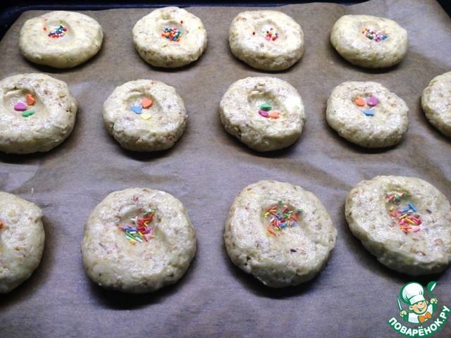 Через 20 минут достаем тесто из холодильника и, слегка смоченными в воде руками, формируем печенье. Я посыпала для дочки кондитерской присыпкой, но это не обязательно. Близко класть печенье не стоит, так как оно растечется немного при выпечке. Выпекаем при 180С до золотистого цвета.