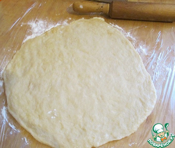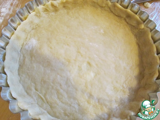 Тесто достать из холодильника. Раскатать по размеру Вашей формы для выпечки, на присыпанном мукой столе.