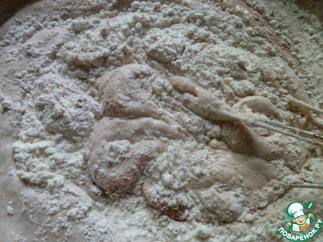 Аккуратно, понемногу просеиваем муку смешанную с содой сразу в тесто и не спеша, перемешиваем до однородности теста.
