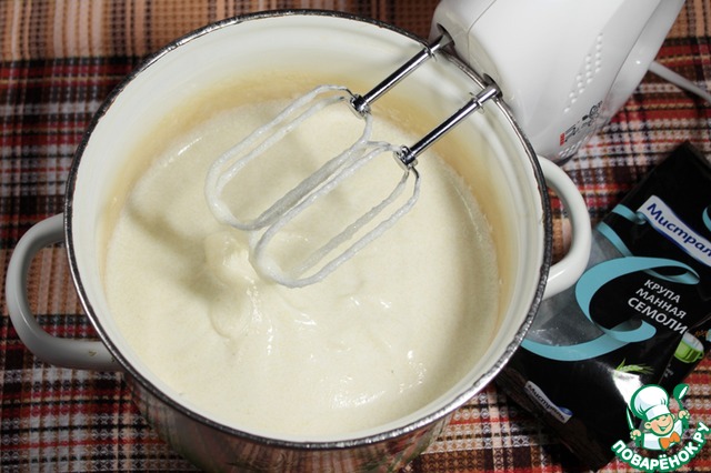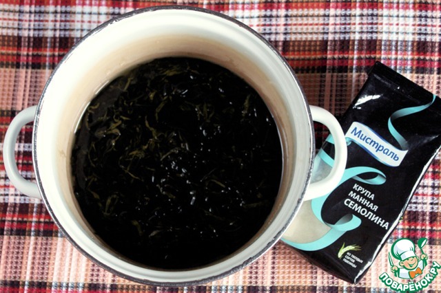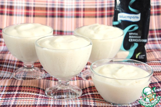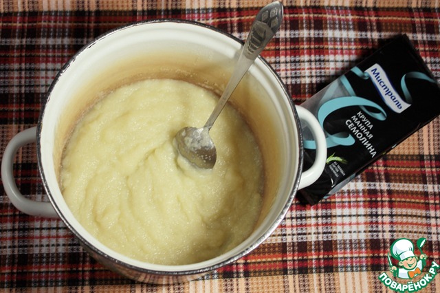 Полученный кипяток довести до кипения. Всыпать тонкой струйкой манную крупу (7 ст. л. с небольшой горкой) торговой марки "Мистраль", постоянно помешивая. Поварить 5 минут, убрать с плиты и остудить при комнатной температуре.