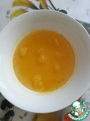 Тем временем займемся соусом. Снять цедру с апельсина. Выдавить с апельсина сок. Смешать сок апельсина с 150 гр. сахара и 50 мл. воды. Довести до кипения и варить 3 минуты, убрать с огня, соус готов. В маленькой чашке смешать 50 гр. сахара, 50 мл. воды, дать закипеть, положить туда цедру и проварить 5 минут. Цедру вынуть из сиропа.