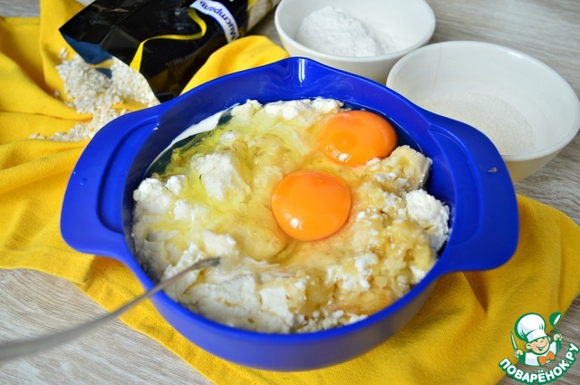 Бананы растолочь. Смешать с творогом. Добавить яйца. сахар и сливки. Хорошо перемешать. Добавить рисовую муку и опять перемешать.