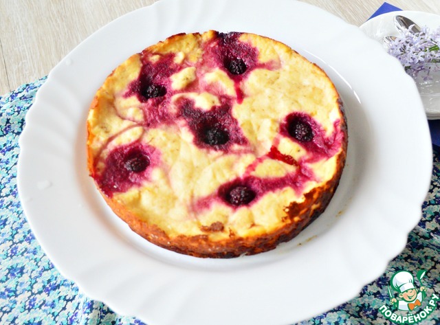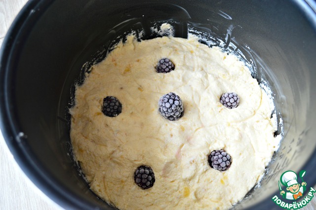 Смазать чашу маслом. Выложить творожную массу. Для вкусноты и красоты вдавить пару ягод ежевики или малины.