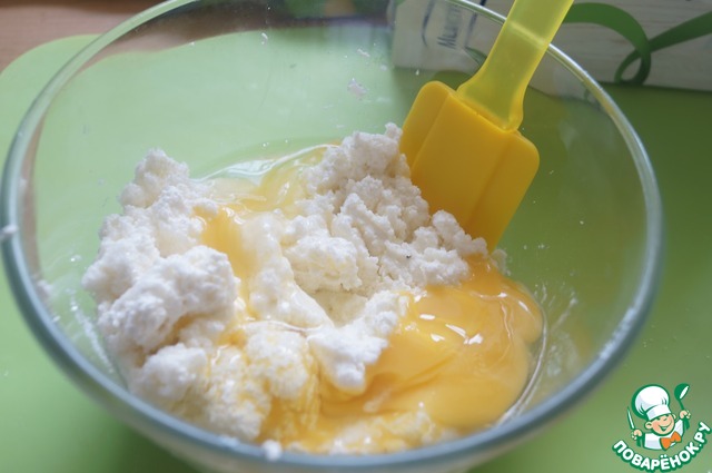 Добавляем к творогу сахар и 2 яйца и 1 яичный белок, перемешиваем до однородной массы. Один желток оставляем для смазывания запеканки.