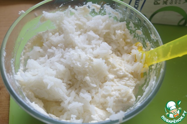 Затем вскрываем пакетик с готовым рисом и высыпаем рис к творогу. Перемешиваем.