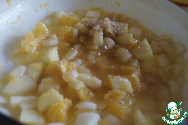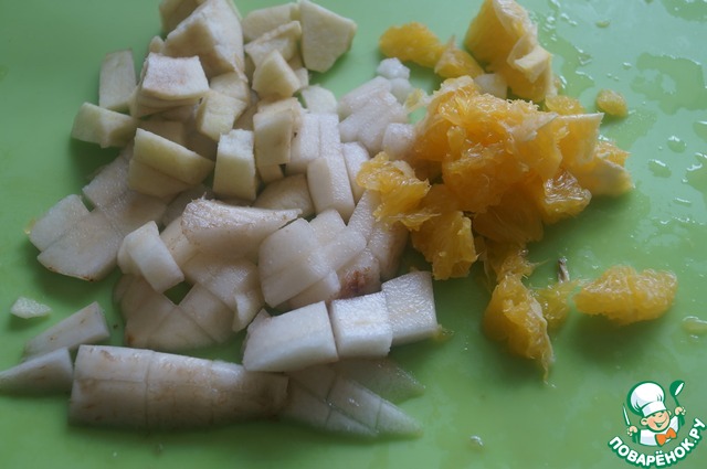 Пока запеканка готовится, приготовим карамелизованные фрукты. Для этого фрукты очищаем от кожицы. Грушу режем произвольными небольшими кусочками. У апельсина отделяем мякоть.