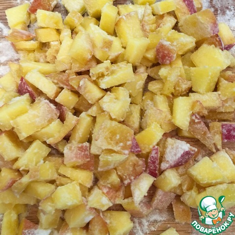 Персики режем на мелкие кубики и обваливаем в муке. Можете взять консервированные, но тогда, порезав их на кубики, дайте стечь соку и обязательно обваляйте хорошенько в муке! Так поступаем с любыми фруктами, которые Вы хотите всунуть в пирог!) Добавляем в тесто и размешиваем.
