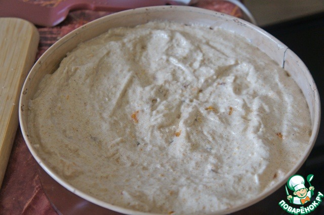 Смазать форму, лучше разъемную, 24-26 см в диаметре, маслом и посыпать сухарями, а еще лучше положить на дно пергамент, осторожно выложить тесто. Распределить его как можно ровнее по всей поверхности формы. Чтобы тесто не поднялось "куполом" в серединке в процессе выпечки, аккуратно сделать движения лопаткой по тесту от центра к краям.