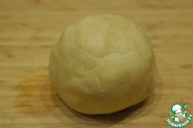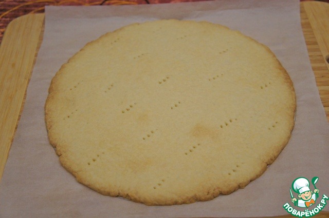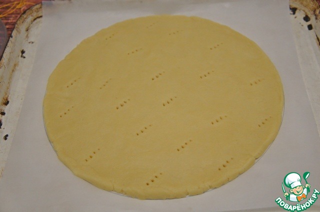 На пекарской бумаге нарисовать окружность, используя донышко от формы. Бумагу хорошо смазать маслом и слегка присыпать мукой. Песочное тесто достать из холодильника, прямо на бумаге раскатать в лепешку размером с нарисованную вами окружность.