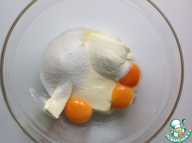 В глубокую миску положите размягченное при комнатной температуре сливочное масло. Всыпьте сахар, добавьте желтки и сухое молоко. Взбейте миксером до пышности.