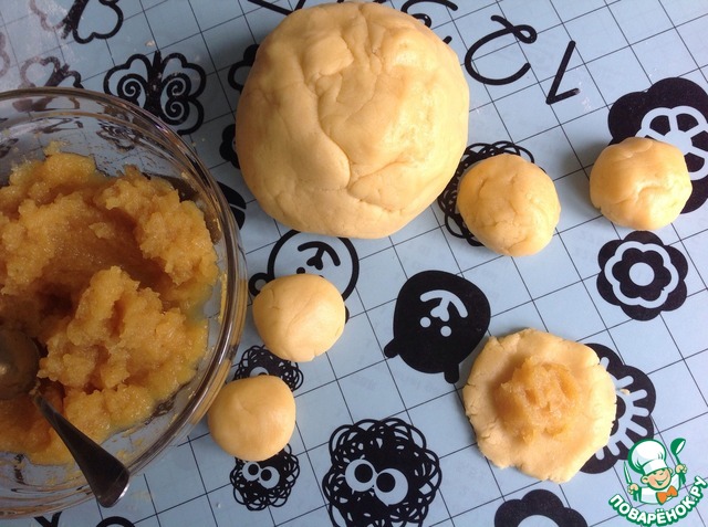 Отрывайте от теста кусочки размером со среднюю сливу и разминайте руками в лепешечки толщиной примерно 5 мм. В центр кладите примерно 1/2 ч. л. джема, собирайте края над начинкой, залепляйте и потом скатывайте между ладонями в ровный шарик.