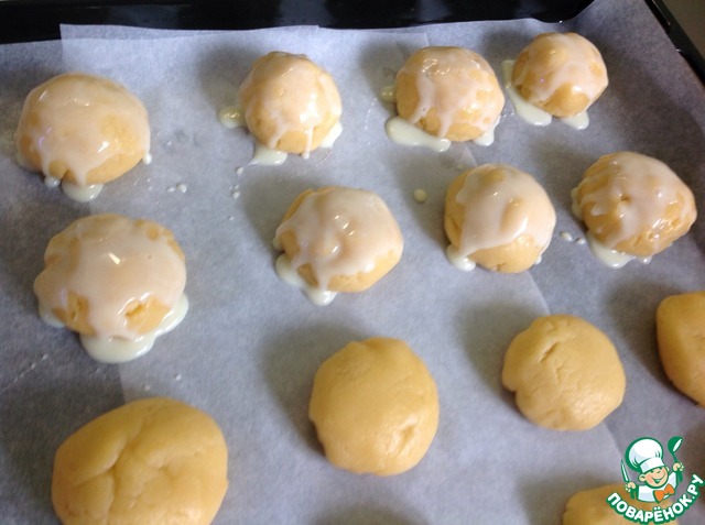 Выкладывайте готовые шарики на противень на некотором расстоянии друг от друга. При помощи кисточки смажет каждый шарик сгущеным молоком. Выпекайте 20 мин при 180С до светло-золотистого цвета. Перед подачей полностью остудите.