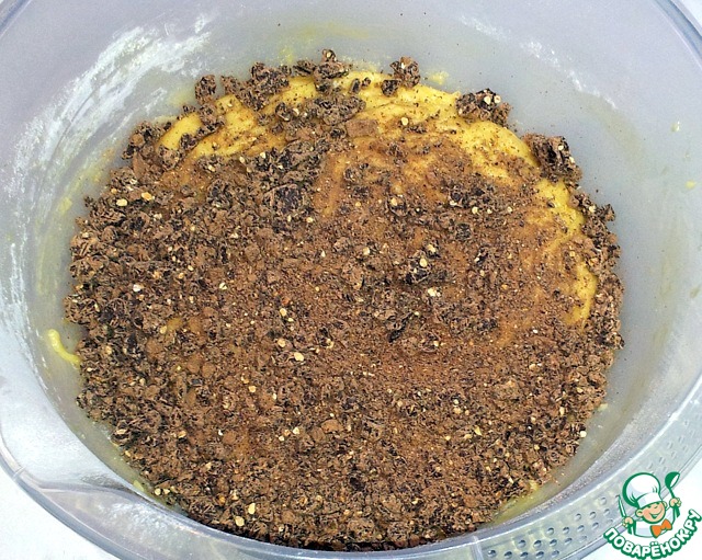 Просеять муку в ёмкость. Всыпать ванилин, разрыхлитель теста, соль. Венчиком взбить яйца с сахаром и вылить в муку. Растопить масло и тоже вылить в миску с мукой. Хорошо перемешать. Тесто получилось вязким, но муку не спешите добавлять т. к будет ещё шоколад и семена. Тесто плотным не должно быть.