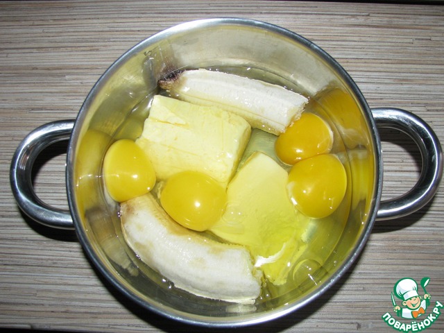 Смешать мягкое масло, 4 яйца и спелый банан. Всё размять вилкой.