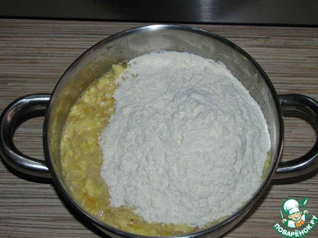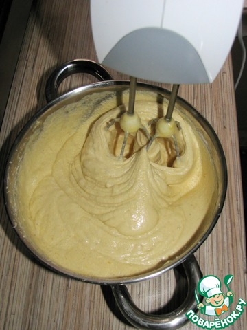 Миксером взбить получившуюся смесь, постепенно добавляя оставшуюся муку. Консистенция должна быть как 30% сметана - достаточно густая, гладкая, но не комковатая, перебор муки там ни к чему. Если получится слишком густо, можно разбавить 1-2 ложками молока.