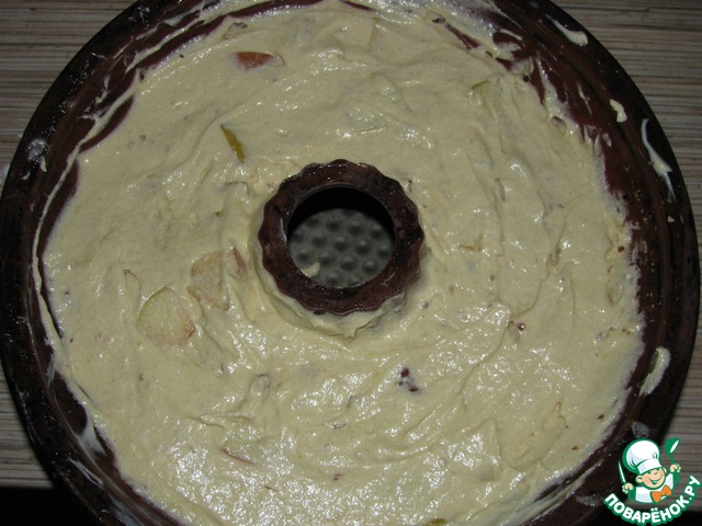 Выложить яблоки в форму, засыпать измельчёнными грецкими орехами (я их слишком мелко не разбиваю, просто ломаю руками на небольшие кусочки).