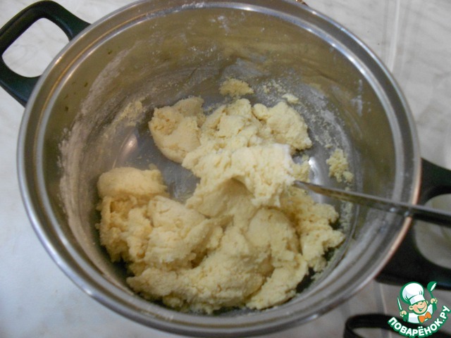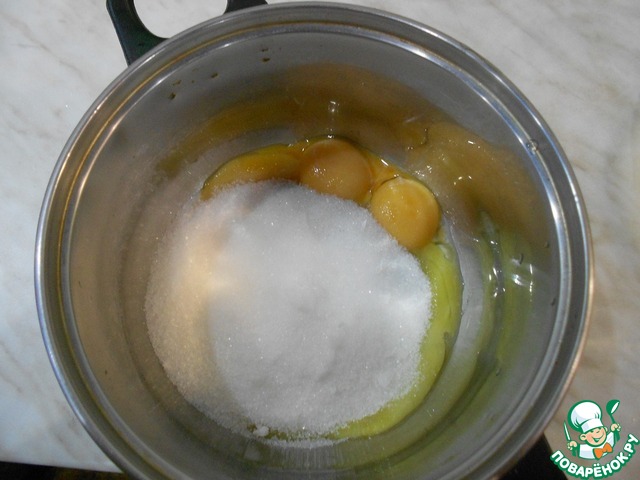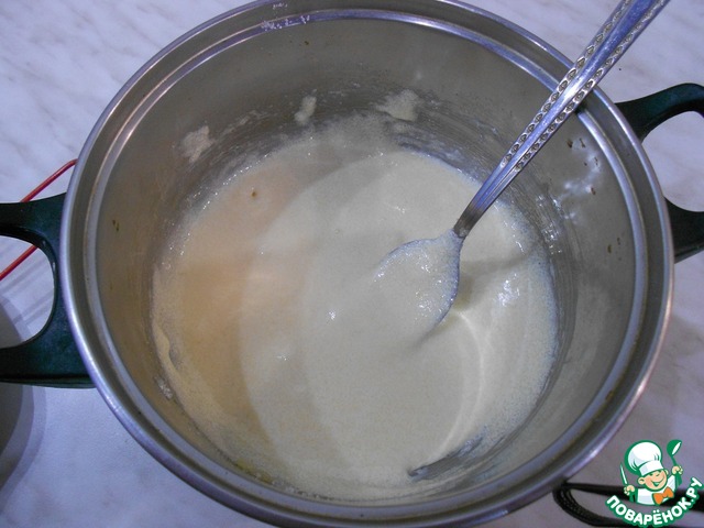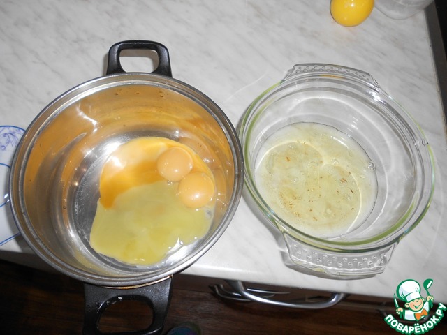 Так выглядят растертые с сахаром желтки. К ним добавляем уксус, перемешиваем. А сода, добавленная к муке ждет своего часа