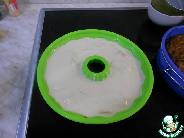 Аккуратно вмешиваем белки в полученную массу до однородного состояния и заливаем в форму с яблоками