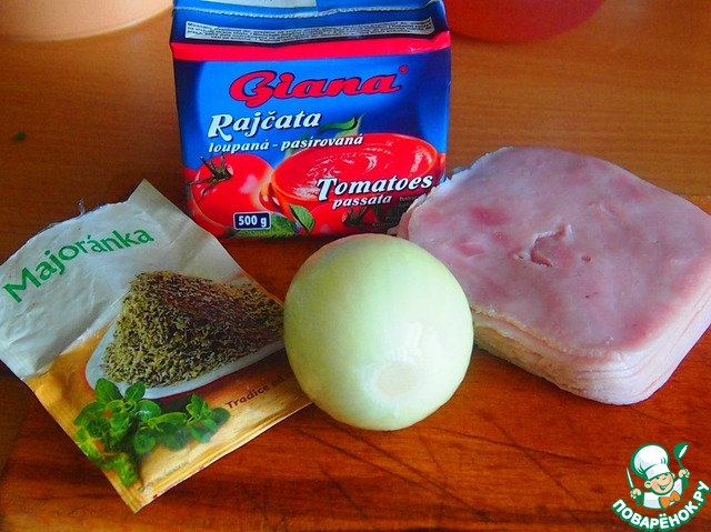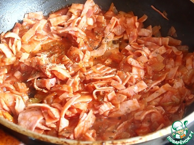 Лук мелко порезать, поджарить на масле до золотистого цвета, добавить тонко порезанную верчину и обжарить пару минут.