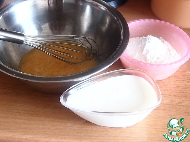 Яйца взбить венчиком, добавить молоко, муку с разрыхлителем, соль и подсолнечное масло. Все хорошенько размешать.