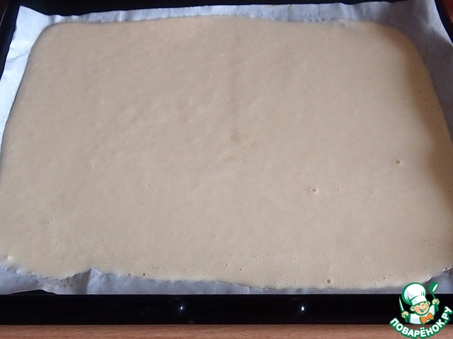 Жидкое тесто вылить на противень, застеленный бумагой для выпечки, и выпекать в разогретой духовке при температуре 180 градусов примерно 15 минут. Главное в этом деле - не пересушить тесто. Я выпекала 16 минут и это уже было на грани, смотрите по своей духовке.