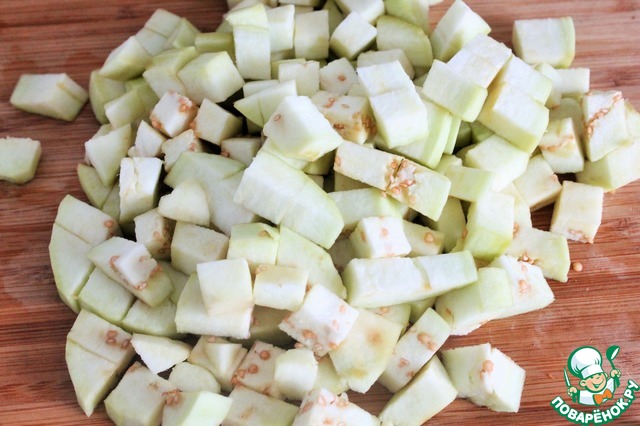 Баклажан моем и очищаем. Нарезаем небольшими кубиками. Заливаем подсоленной водой и оставляем на 20 минут. Затем обсушиваем с помощью бумажного полотенца.