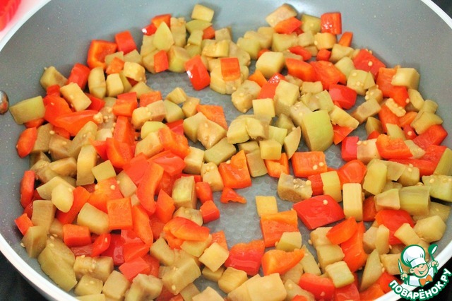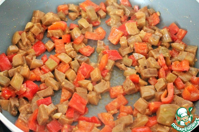 На сковороде разогреваем немного растительного масла. Обжариваем баклажан и перец. По времени примерно 5 - 7 минут. Жарим на сильном огне постоянно помешивая.