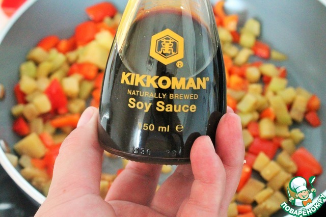 Затем добавляем 2 ст. л. соевого соуса Kikkoman. Обжариваем в течение 2 минут.
