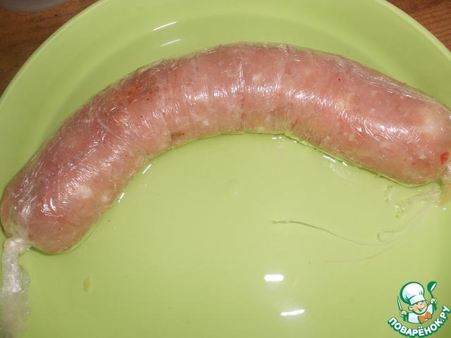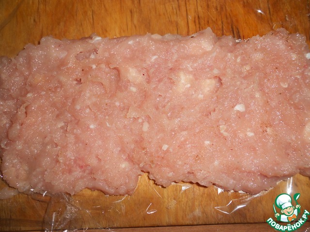 Куриный фарш посолить, поперчить, добавить щепотку мускатного ореха, перемешать. Ровным слоем выложите фарш на пищевую пленку, смоченную водой.