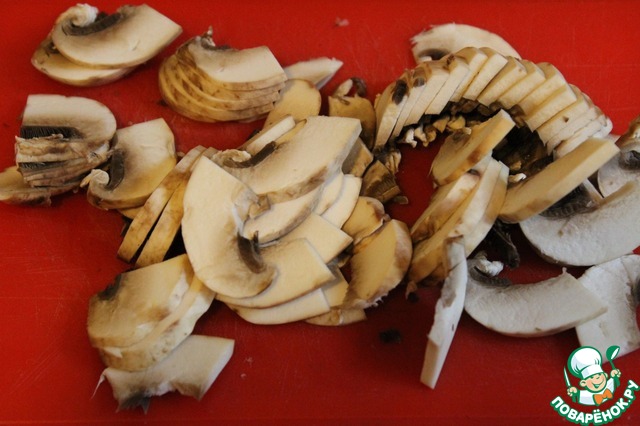 Шляпки шампиньонов нарежем тонкими ломтиками, четвертая часть пойдет на приготовление соуса, а большая часть - в кашу.