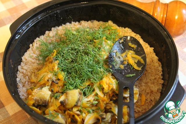 За время подготовки овощей и грибов гречневые хлопья успели распариться, и в них можно уже добавить лук, морковь, грибы и укроп, все перемешаем.