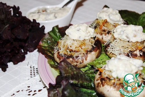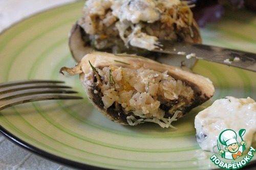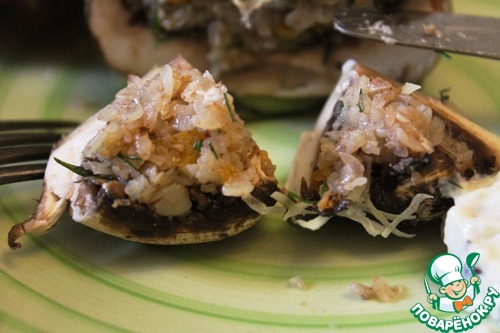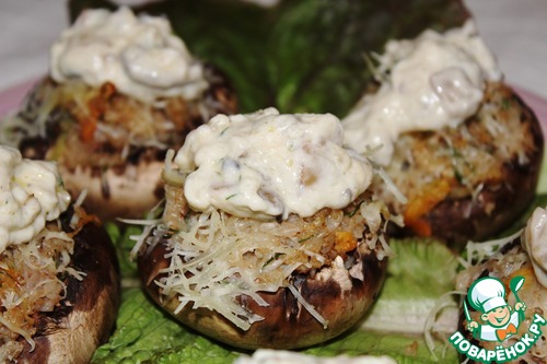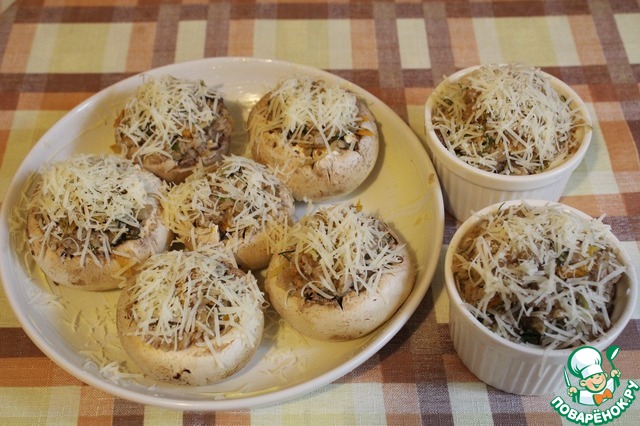 Готово. Если, по какой-то причине, вам неприятен легкий хруст свежих грибов, то придется удлинить процесс, и перед фаршировкой подержать грибы в духовке при тех же 180 град минут 10.