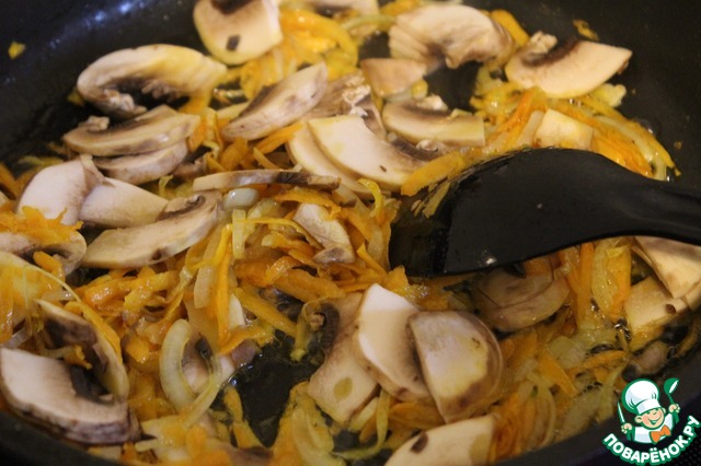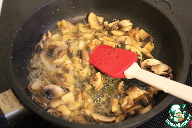 Добавим ломтики грибов и продолжим жарить, пока из грибов не выпарится вся жидкость.