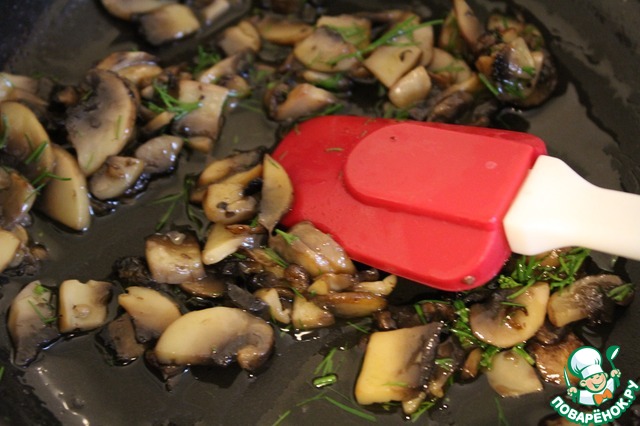 Тонкие ломтики шляпок обжарим в смеси оливкового и сливочного масел.