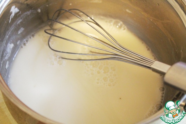 В остывший бульон введем порциями муку, размешаем, комков быть не должно.