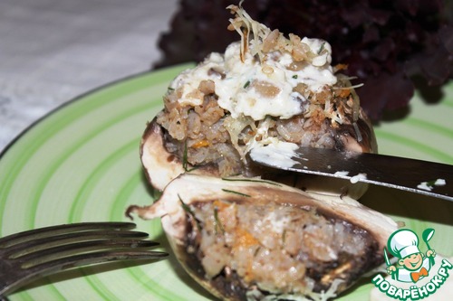Нафаршируем гречишно-овощной смесью шляпки грибов (с горкой), остатки я выложила в рамекины, смазанные сливочным маслом, на дно - немного соевого соуса, сверху посыпаем тертым сыром. Запекаем в заранее нагретой до 180 град. духовке до подрумянивания.