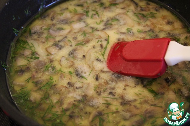 Зальем мучным бульоном грибы так, чтобы он только покрывал их, доведем до кипения, проварим пару минут