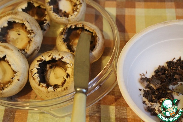 Шампиньоны внутри вычистим (удалим пластинки), нальем в каждый по чайной ложке соевого соуса.